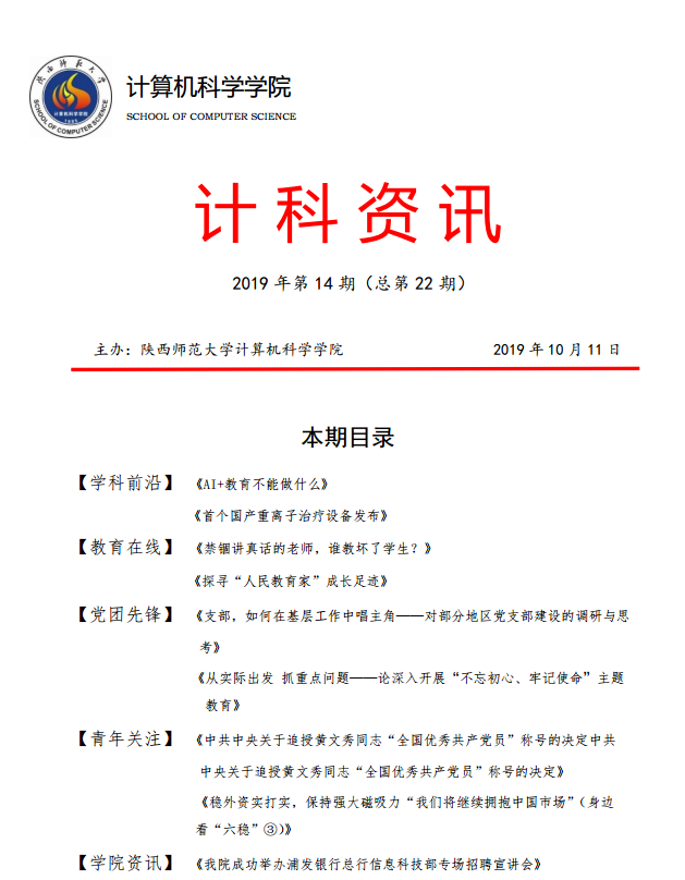 《计科资讯》是爱爱视频 编辑整理的电子资讯,信息来源为《光明日报》《人民日报》《中国青年报》等权威纸媒,编辑工作由学院优秀本科生党员、团员承担。《计科资讯》主要包括学科前沿、教育在线、党团先锋、青年关注及学院资讯五个版块。学院师生可以从中了解到专业前沿和国家时政大事,欢迎大家下载阅读。