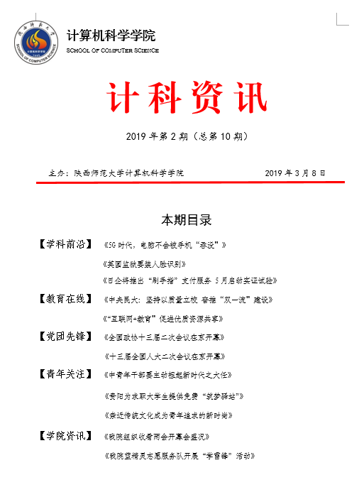 《计科资讯》是爱爱视频 编辑整理的电子资讯,信息来源为《光明日报》《人民日报》《中国青年报》等权威纸媒,编辑工作由学院优秀本科生党员、团员承担。《计科资讯》主要包括学科前沿、教育在线、党团先锋、青年关注及学院资讯五个版块。学院师生可以从中了解到专业前沿和国家时政大事,欢迎大家下载阅读。