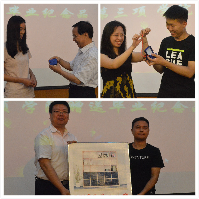 随后,学院和毕业生互送礼物。首先院长王小明和副院长马苗代表学院为毕业生代表赠送纪念品——定制纪念戒。纪念戒盒子上印着学院院徽和爱爱视频