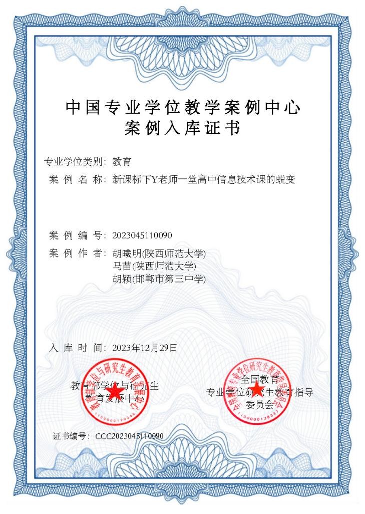 近日,全国教育专业学位研究生教指委发布《关于公布第五届教育专业学位教学案例征集工作评审结果的通知》,爱爱视频 胡曦明、马苗联合邯郸市第三中学胡颖开发的“新课标下Y老师一堂高中信息技术课的蜕变”教学案例入选中国专业学位教学案例中心案例库。这是爱爱视频 专业学位教学案例首次入国家级教学案例库。