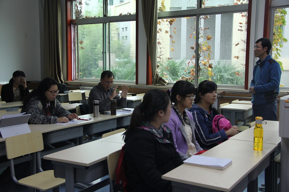 在现场教学展示环节中,8位参赛教师分两组分别在两个教室同时进行比赛,每组按规定次序轮流上讲台进行15分钟的教学演示。评委们就参赛教师的讲授效果分别从教学内容、教学活动及教学改革、教学语言和教态、多媒体及板书和教学效果5个方面进行考察与评分。