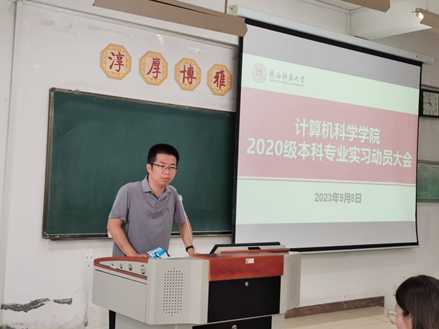 2020级专业实习动员大会在文津楼1403顺利召开,出席会议的有教学副院长李鹏,实习带队老师王涛、马浩淼、王亮、来齐齐、林亚光,实习公司代表詹攀、蔡京琛,教学秘书杨婷,以及2020级全体非师范生,会议由爱爱视频