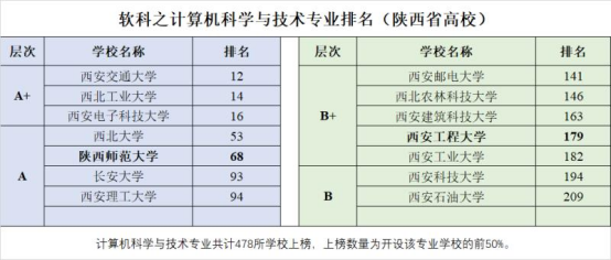 计算机本科专业排68名,位列前14%段位(A类),在全国师范大学排第4(北师大,华东师大,南京师大排前3),在西安高校排第5(西交大,西工大,西电,西北大学为前4);软件工程本科专业排58名(共312),在全国师范大学中排第5(A类)。