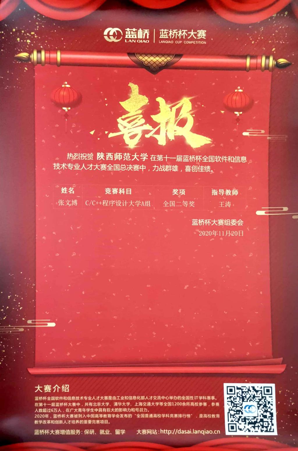 17级学生张文博赴西安邮电大学参加第十一届蓝桥杯大赛总决赛,经过四个小时的紧张比赛,荣获国家二等奖。