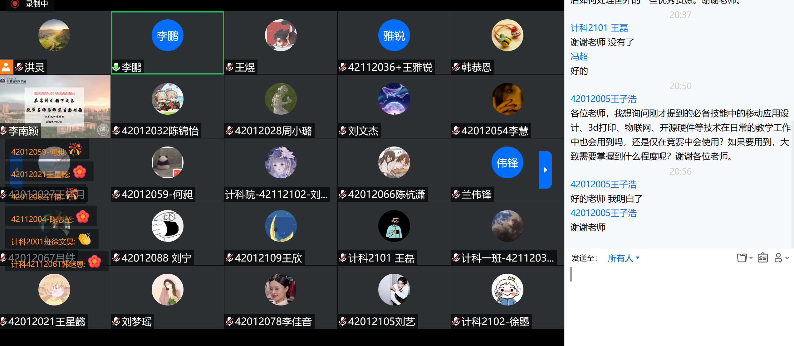 随后,参会同学就自主学习、课堂管理、考资格证、双语教学实践、跨学科融合等问题与四位名师热烈交流。李鹏副院长最后做了总结发言,他指出邀请教学一线教学名师来院指导交流是师范生高质量培养的重要举措,希望同学们充分汲取本次活动内容要点,学习四位老师的教学工作经验,为成长为“四有”好教师做好充分准备,并向四位老师的专业指导表示感谢。同学们送出了鲜花和掌声感谢老师们的精彩分享,并致以节日的问候。
