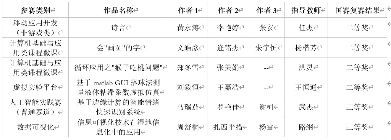 有6组共计16人参加了包括人工智能实践类(普通赛道)、移动应用开发(非游戏类)、计算机基础与应用类课程微课、虚拟实验平台、数据可视化等5个类别的竞赛,最终获得二等奖4项、三等奖2项。
