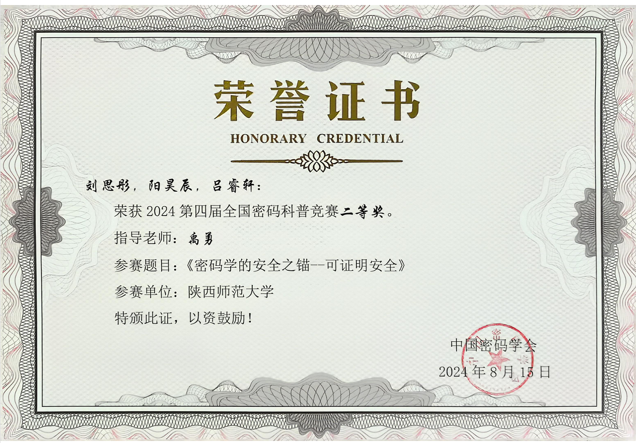 禹勇教授指导、研究生刘思彤、阳昊辰、吕睿轩共同制作的密码知识科普视频《密码学的安全之锚--可证明安全》获2024第四届全国密码科普竞赛二等奖。
