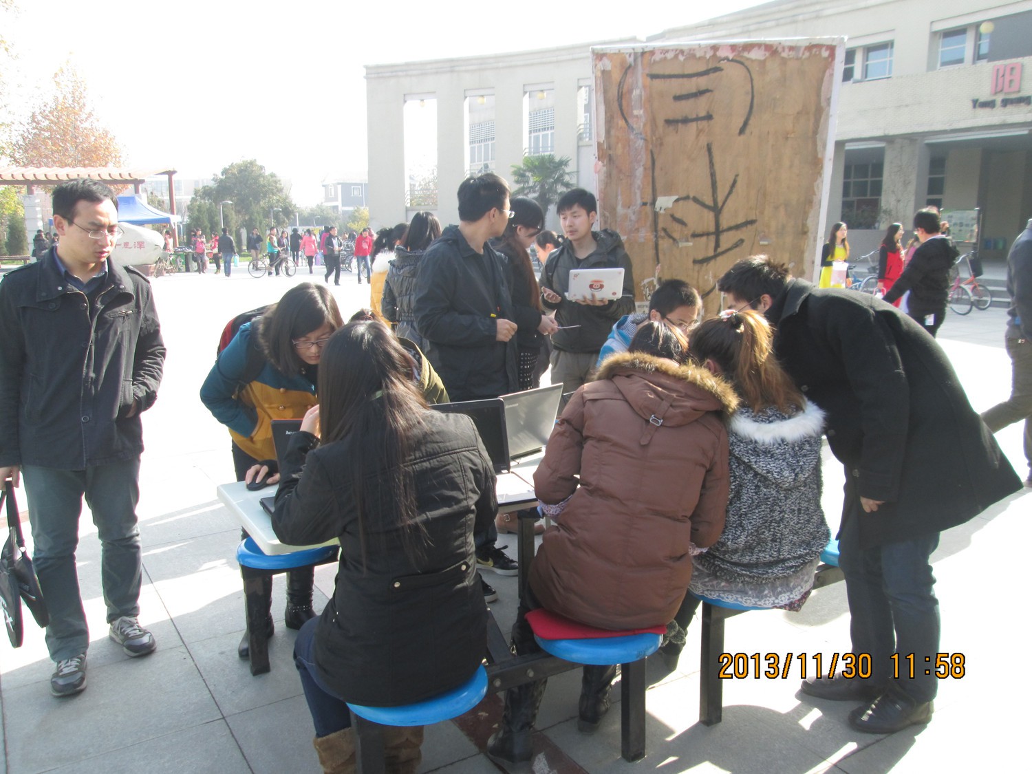 早晨九点,成员们就做好了各项准备,活动一开始就吸引了很多同学前来围观,现场气氛非常热烈,虽然天气很冷,但是大家一点也不在意,都是忙得不亦乐乎,在各自的战场上,挥洒着热情,尽心尽力为大家服务。本次活动共计帮助了50多位同学,解决了“重装系统”,“开机速度慢”,“系统分区”,“装不上个别学习软件”等诸多问题,获得了大家的一致好评。特别是华葱、张辉、向昌成,李晨,刘冬青等几位同学,不仅尽心尽力帮助同学们解决当前难题,还热心的给大家讲解了解决方法及平常会遇到的一些其他电脑问题,使得本次活动充实而圆满。