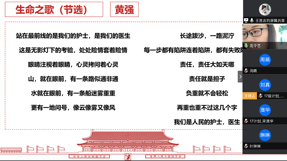 在最后的总结发言中,陈应权老师谈到,要珍惜别人付出辛苦劳动甚至是生命为我们创造的美好生活和疫情防控良好局面,要用自己的实际行动去捍卫来之不易的成果;要时刻铭记包括这次疫情的重大事件中为大家舍小家的平凡英雄们,不忘来路、始知归处;要透过我们所遇见的每一次灾难去反思,反思我们的言行举止是否符合我们的党员身份。王楠老师首先向同志简单地介绍了自己自疫情以来在学校疫情防控工作指挥部的工作。她表示,从国家层面来看,这次疫情大考彰显了社会主义制度的优越性,体现了人类命运共同体这一观点的正确性,是一场生动的爱国主义教育;从社会层面来看,尽管存在极少部分不和谐声音,但绝大多数中国人都主动担起社会责任,相信科学、相信权威,不信谣、不传谣;从个人层面来看,无论是奔赴一线还是居家抗疫,都是在为我国疫情防控工作贡献自己的力量。最后,她希望同学们在家学习生活之余,不忘积极参加劳动,锻炼身体,以最好的身体和心态迎接生活中的每一天。