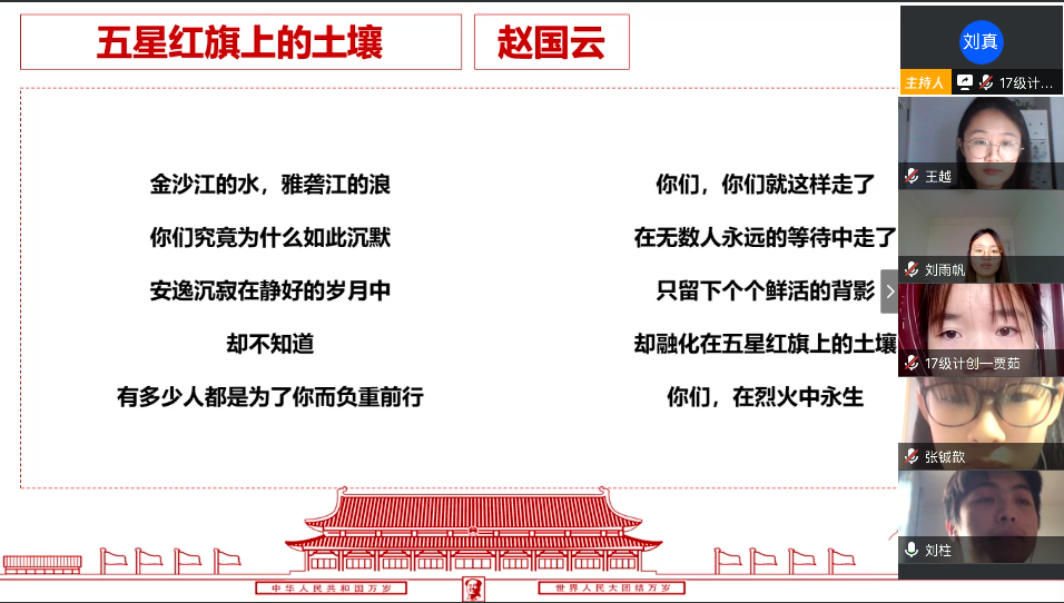 随后,高令艺、张雅楠和王越等同志依次带来诗歌朗诵《生命之歌》、《清明谣》和《五星红旗上的土壤》,寄托对英雄的无尽哀思,迎候生命的生生不息。