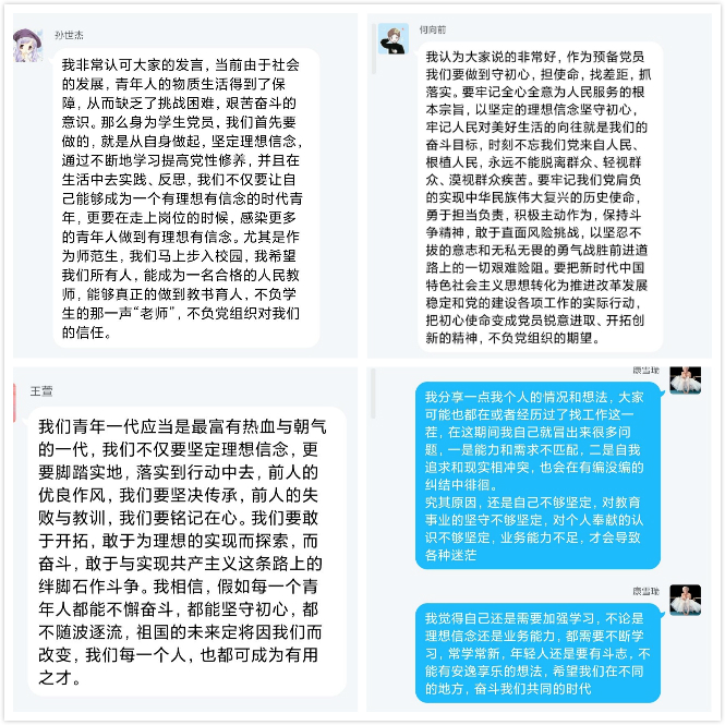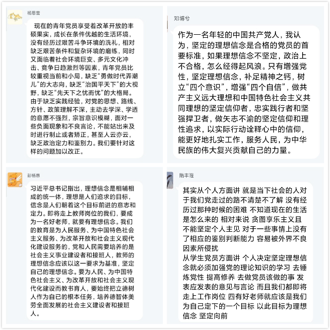 距离党员学习计划开始已一月有余,大家都有计划地开展着自主学习,在交流中,大家分别谈了自己在学习过程中的想法。针对青年党员如何在新环境下坚定理想信念,杨思誉同志首先提出,现在的青年党员相对缺乏艰苦条件和复杂环境的磨练,同时又面临着社会环境巨变、多元文化冲击、竞争日趋激烈等挑战,需要有“勇做时代弄潮儿”的大志向、“治国平天下”的大视野和“先天下之忧而忧”的大格局。康雪瑞同志表示,和平建设时期,我们没有像革命战争年代那么直接的方式去检验一个共产党员的理想信念是否坚定,就看我们能不能做到坚守自己的岗位,能不能在复杂的政治环境中保持清醒的头脑,能不能吃苦在前享乐在后。正如邓博兮同志在交流中所说,坚定的理想信念是合格的党员的首要标准,如果理想信念不坚定,政治上不合格,怎么经得起风浪。彭杨惠同志结合我们即将走上教师岗位的现实情况,就“理想信念”谈了自己的心得体会,她说,要成为一名好老师,就要有坚定的理想信念,教师的理想信念要以教育的要求为基准,为人民、为中国特色社会主义、为改革开放和社会主义现代化建设而教书育人,要始终把立德树人作为教育的根本任务,培养德智体美劳全面发展的社会主义建设者和接班人。随后,隋丰隆同志从个人方面和学生党员的角度分析了如何坚定理想信念,他说,当下社会的人对于我们党走过的路不清楚不了解,没有经历过那种时候的种种困难,相对于一些事情缺乏相应的鉴别判断能力,容易被外界不良因素所侵扰。要坚定理想信念就必须加强党的理论知识的学习,锤炼党性,提高修养,做党员该做的事,发表应发表的意见与言论,将四有好老师定为我们的一个目标,以此目标为理想信念,坚定向前。其他同志也都就学习主题进行了交流发言。