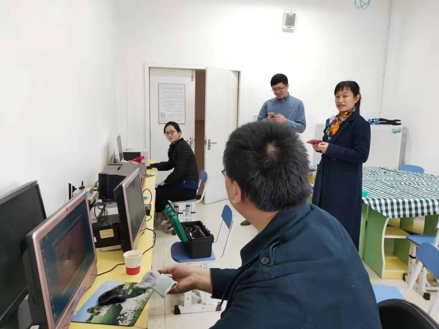 附属幼儿园开展学雷锋活动。志愿服务队受到了幼儿园张园长、办公室李老师、机房黄老师的热情接待。按照分工计划,队员们分四组对幼儿园办公区、保育室、教师阅读室、电脑室以及16个教学班级的办公电脑进行了优化,找出了音响和鼠标等硬件中存在的故障,进行了投影仪连接、常用软件安装、驱动升级、磁盘清理等服务,还为办公区安装了电脑搁物架,帮助老师们更加顺利地开展各项教学活动。