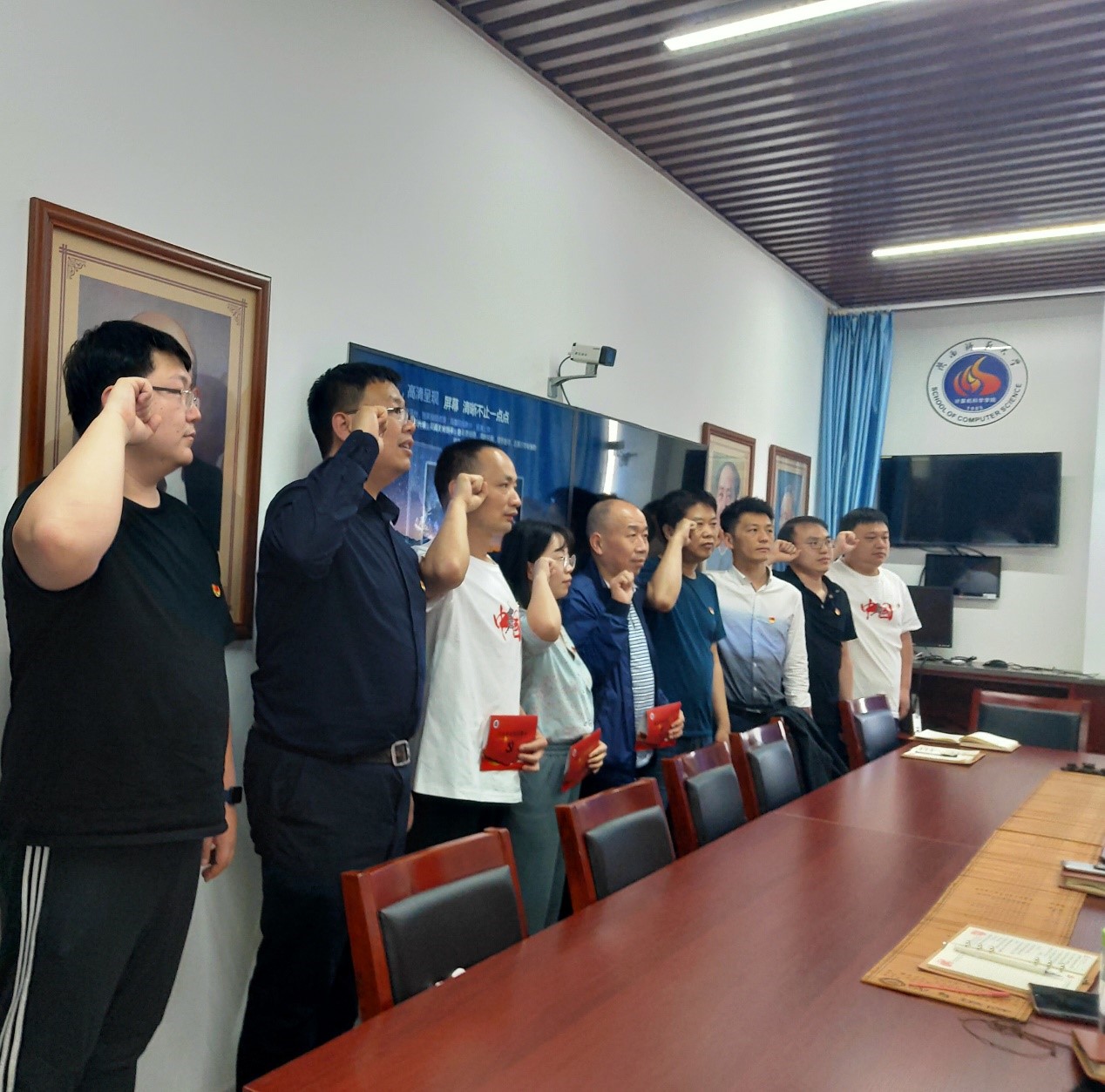 观看视频前,首先欢迎学院党委书记王耀明参加支部会议,并为本月入党的同志颁发党员政治生日贺卡,参会的所有同志一起庄严宣誓,重温入党誓词。