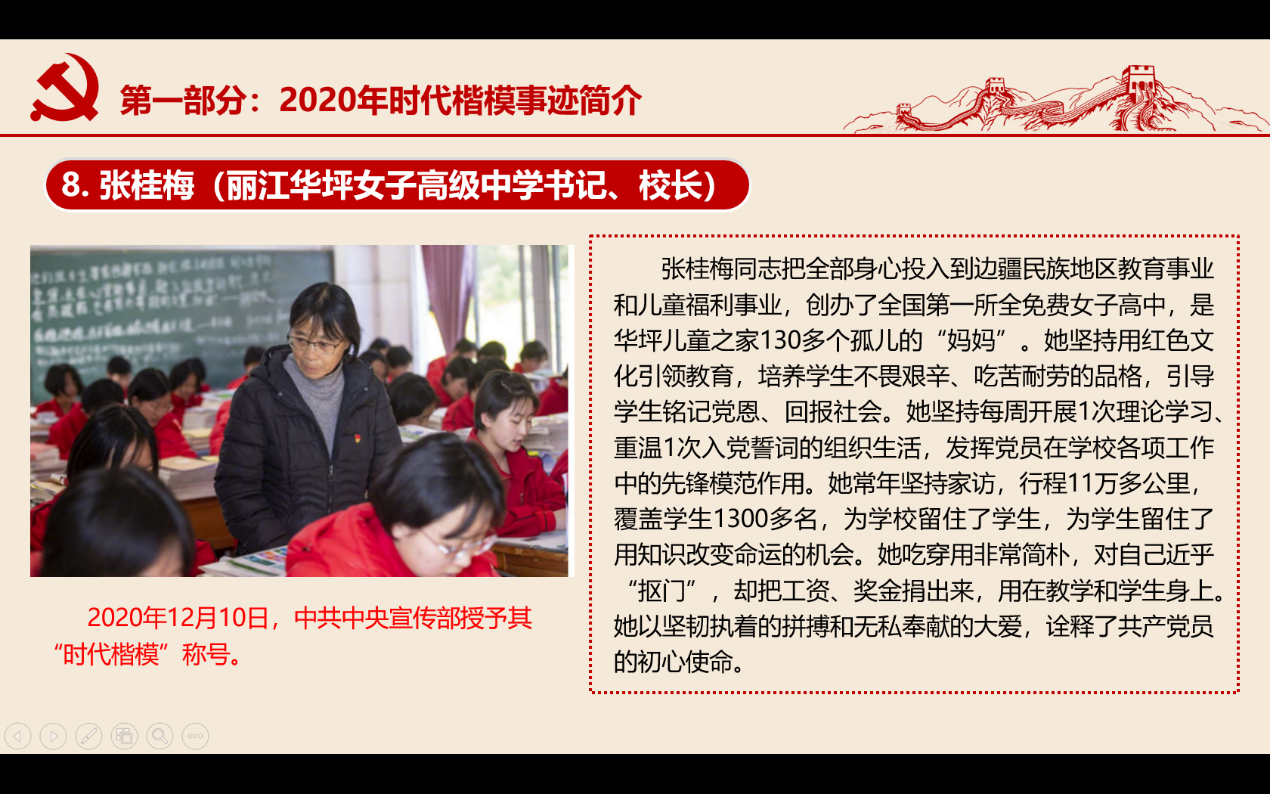 会上,杜愈超、宋海林等同志依次为大家分享了2020年时代楷模事迹简介。敦煌研究院文物保护利用群体、闽宁对口扶贫协作援宁群体、陆军第74集团军某旅“硬骨头六连”、 江西九江消防救援支队、国家援鄂抗疫医疗队等10个抗疫一线医务人员英雄群体、抗美援朝志愿军老战士孙景坤、徐振明、脱贫攻坚一线优秀党员干部代表黄诗燕、毛相林、丽江华坪女子高级中学书记、校长张桂梅,支部党员认真聆听学习,深刻感悟领会。