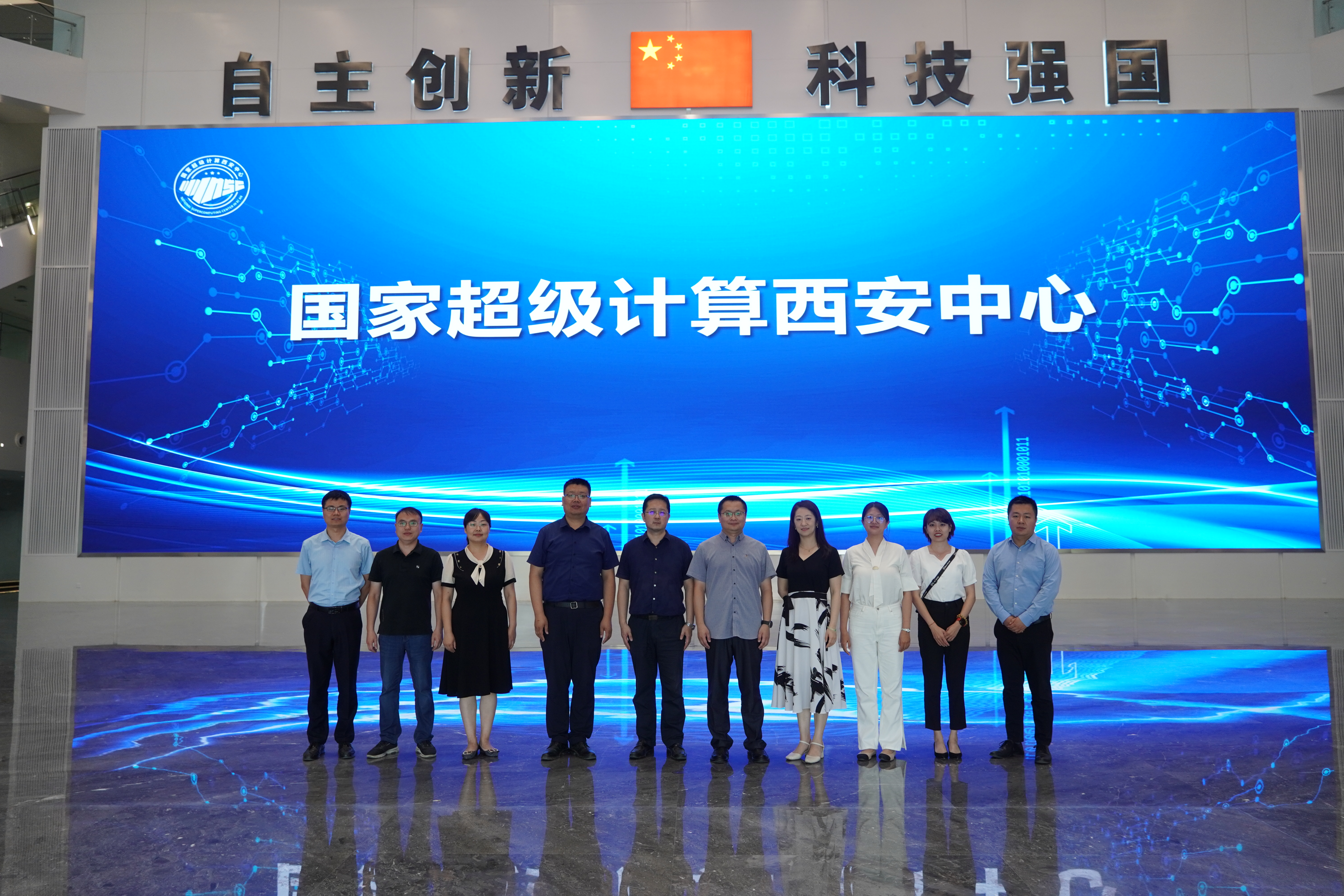 在国家超算(西安)中心,一行人在工作人员的陪同下参观了科学馆,认真了解了世界计算机阶梯式的发展阶段和计算时代。随后,双方开展座谈交流,中心技术骨干宋乐向与会人员介绍了超算中心的成立背景、建设历程、基本情况、项目进展、工程计算和人工智能等方面主要应用前景及其平台级业务孵化创新能力等情况,双方就如何进一步建立紧密联系并开展下一步深入合作进行了沟通探讨。