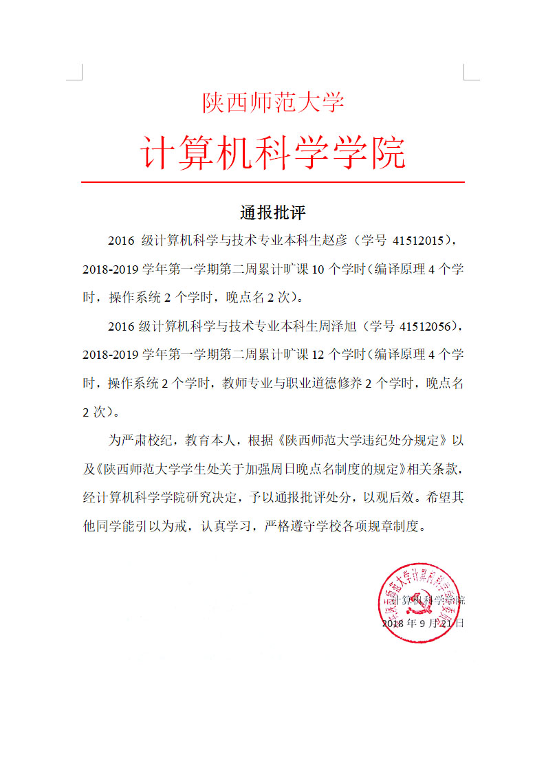 关于2016级学生赵彦、周泽旭的通报批评