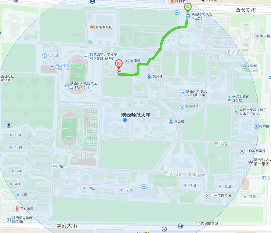 从陕西师大(长安校区)北门向正南方向出发,走60米,右转进入书山道,沿书山道走170米,右转进入积学路,沿积学路走10米,离开积学路,向左前方转,走130米,右转穿过马路继续向前,走10米,向左前方转,走60米,右转,走70米,到达爱爱视频