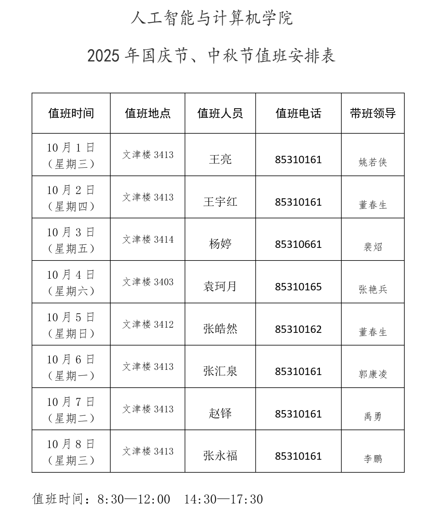 人工智能与计算机学院2025年国庆、中秋假期值班安排