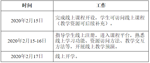 学院将按照学校统一部署,严格执行教务处关于本学期教学时间的调整,推迟2020年春季学期开学时间,不提前组织学生报道,春季学期本科教学仍按照19周进行,按原定开学时间和课表,2月17日学院将如期开展线上教学工作,组织学生线上学习,保证延期开学期间学生推迟到校不停学习。
