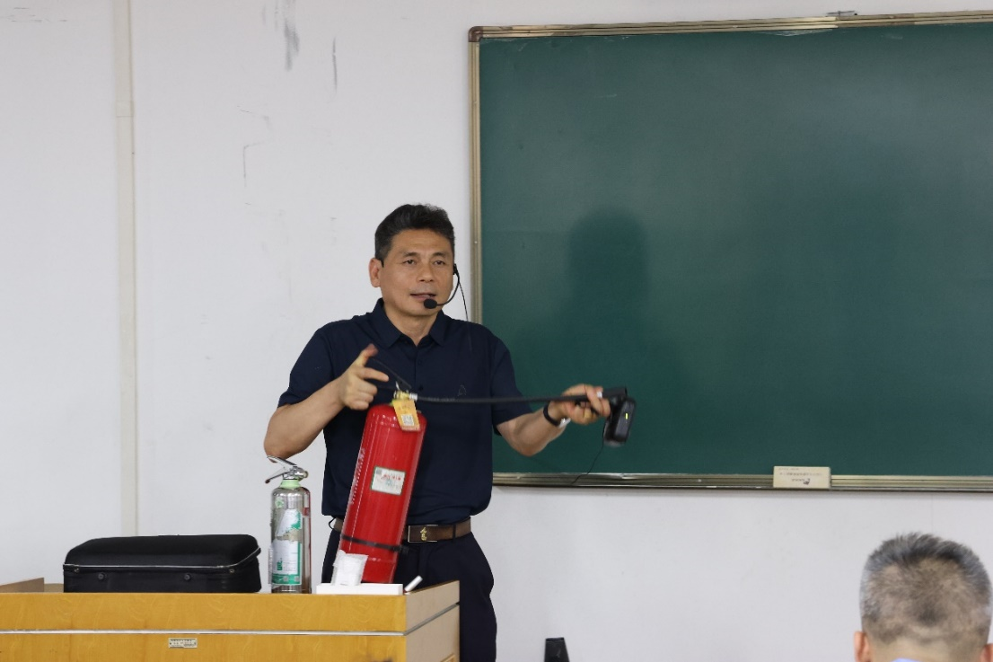 晁奭昕教官对同学们进行了消防安全知识培训,包括消防设施器材使用、火灾逃生等重要内容,现场进行了消防灭火器使用的演示,并就使用细节做了专门说明,进一步提高了同学们的消防应急自救能力;特别是通过播放了火灾现场视频,让同学们充分认识到珍惜生命,提高消防安全意识的重要性。最后,晁教官通过现场问卷的方法征集了大家对于消防安全知识的了解情况。