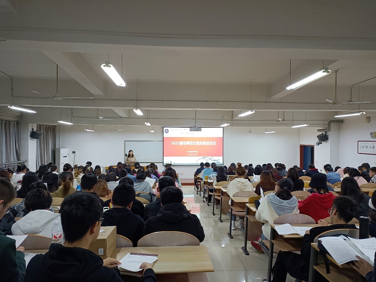 在文津楼3121报告厅召开2022届非师范本科毕业生就业推进会议,学院党委副书记郭康凌、2022届全体非师范毕业生参加会议。会议由毕业班辅导员田海东主持。