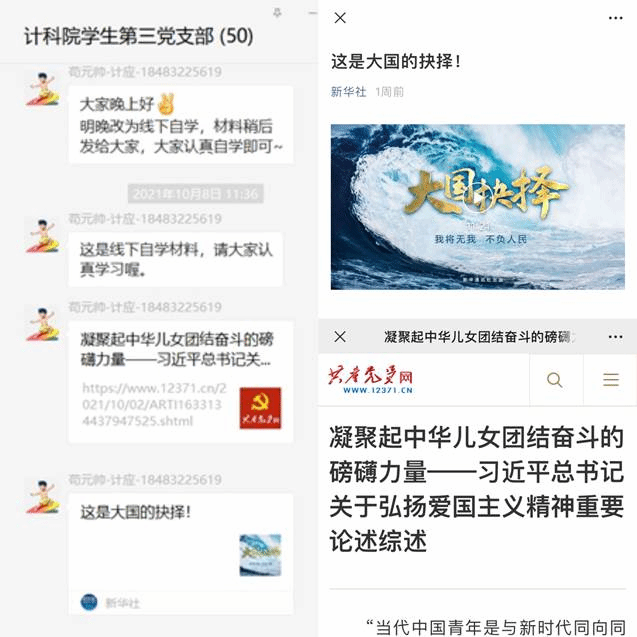 学生第三党支部组织支部同志们线下自行观看新华社微纪录片《大国抉择》,并认真自学《习近平总书记关于弘扬爱国主义精神重要论述综述》,增强了支部成员们的爱国情怀,坚定了支部成员们建设祖国的理想信念。