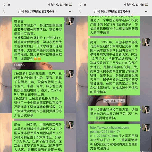 2019级研究生团支部积极开展线上爱国主义教育活动,深入学习贯彻习近平总书记“七一”重要讲话精神,鼓励同学们观看电影《长津湖》。