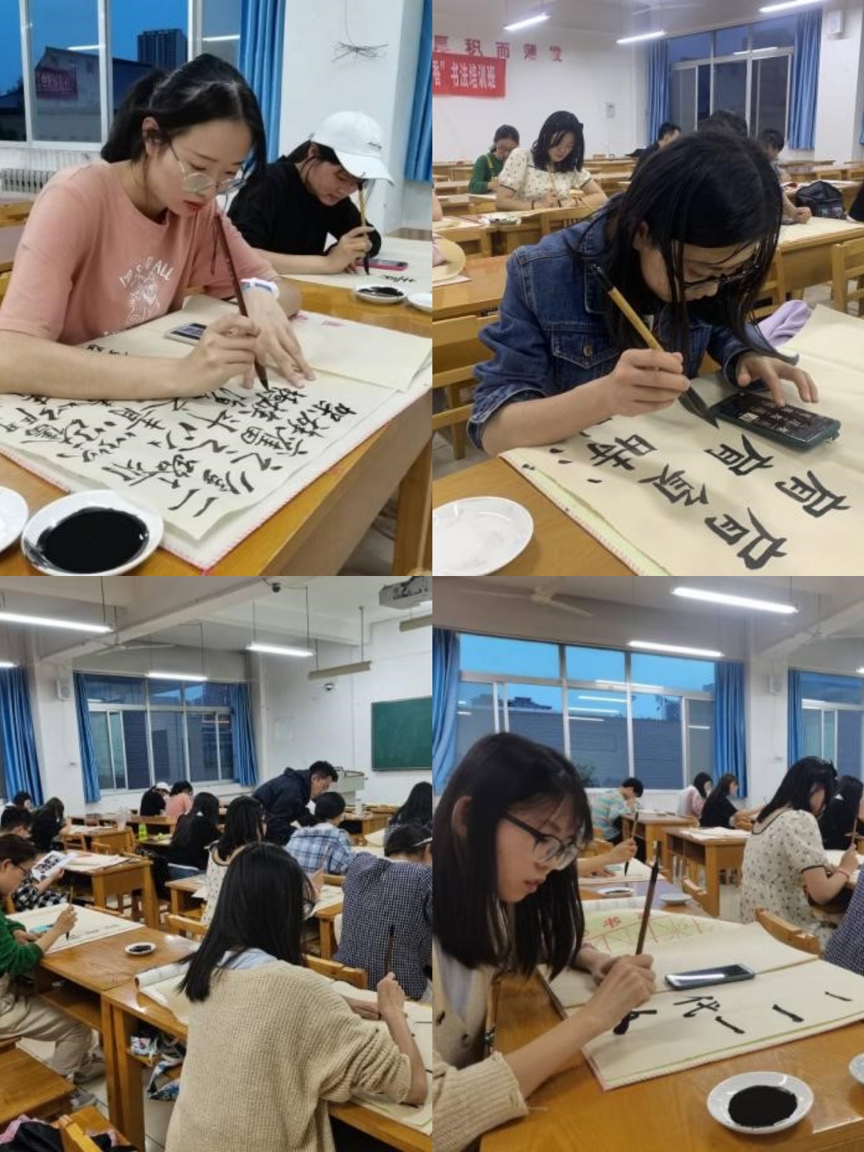 第四期“翰墨书香”书法培训班于2021年5月6日晚在文津楼1419教室开展了“谱青春华章、展时代风采”主题书写活动。