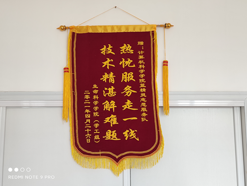 2021年4月27日,蓝精灵志愿服务队收到了一面来自生命科学学院(学工组)赠予的锦旗,上面写着:“热忱服务走一线,技术精湛解难题”。这面锦旗,不仅是对蓝精灵志愿服务队过去工作的肯定,更是一种鞭策,鼓舞着队员们不断提升自己的专业水平和扎实技能,更加尽心尽力地为广大师生服务。
