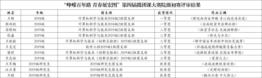 经作品集中展示与讨论评议,计科1802团支部书记王琳《栉风沐雨百年路 青心向党再出发》等2件作品荣获一等奖,计科1902团支部书记周舒桐《扶贫多壮志 天地换新颜》等3件作品荣获二等奖,软工1901团支书王灵芝《弘扬抗疫精神凝聚青春力量》等3件作品荣获三等奖,研究生团支部书记王军梅《决战决胜脱贫攻坚》等3件作品荣获优秀奖。学院将推送获得一等奖的2件作品参加校级比赛。