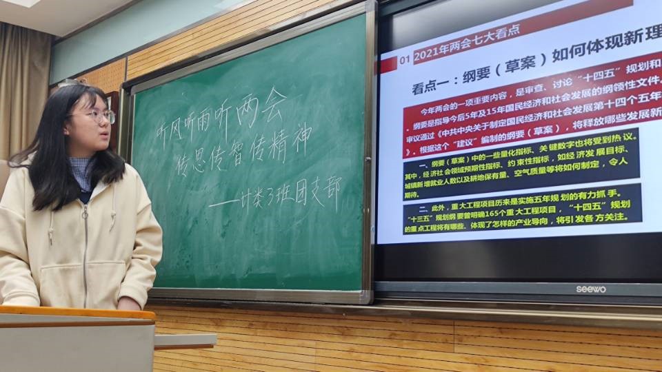 随后副班长王丽对两会的相关知识进行了介绍,具体包括两会基本情况、基本议程、两会的看点和关键词以及对2021的展望。