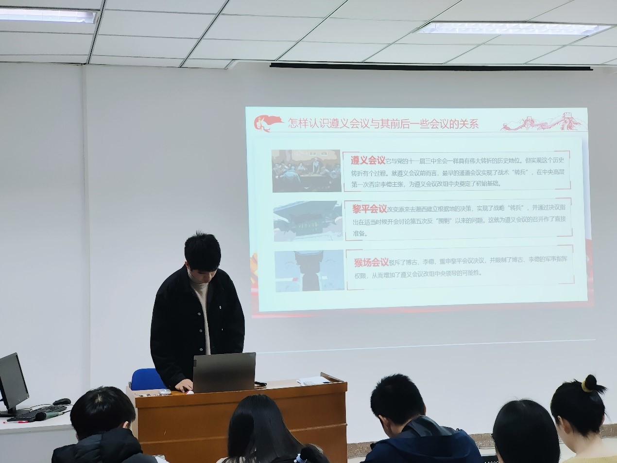 最后,支部党员杜愈超以《从“党史”中再识长征》为题从红军长征的基本概念、遵义会议与其前后一些会议的关系、红四方面军在长征中的贡献和作用、中央红军长征到达陕北后的“两个奠基礼”四个层面讲述了长征故事,带领大家重温历史。