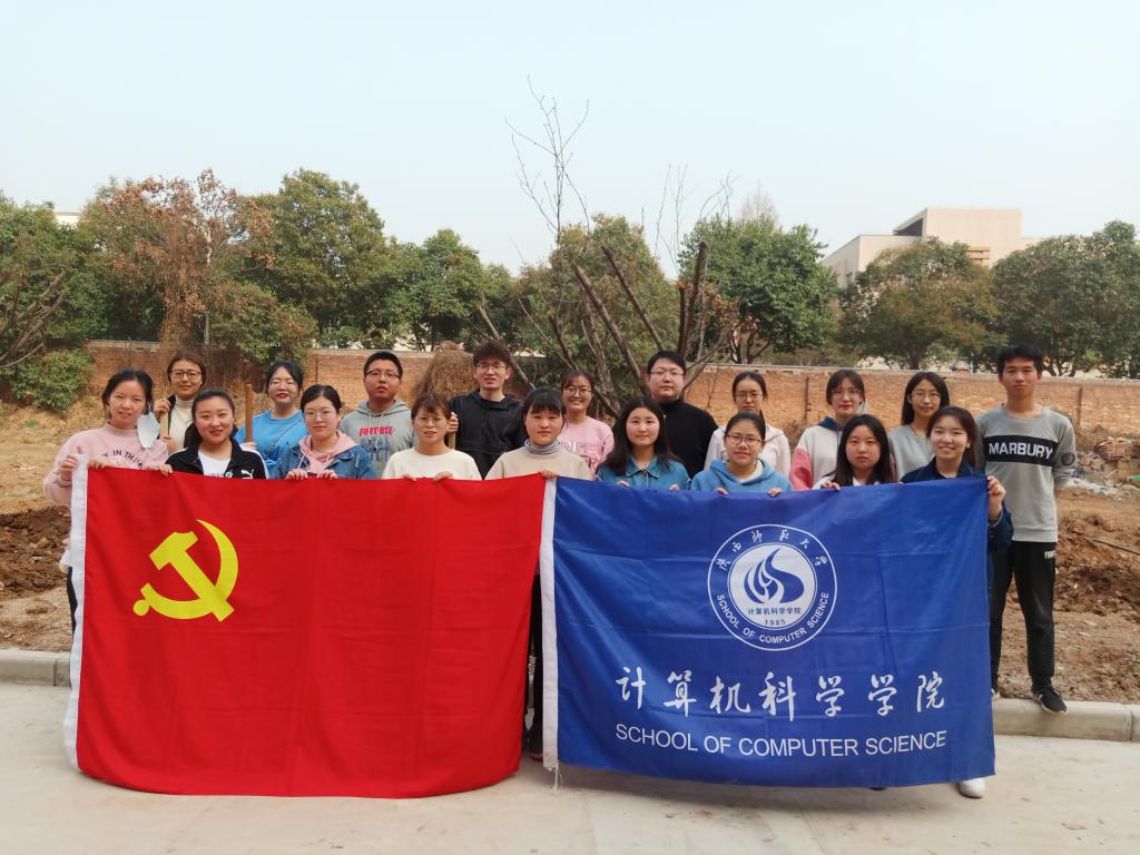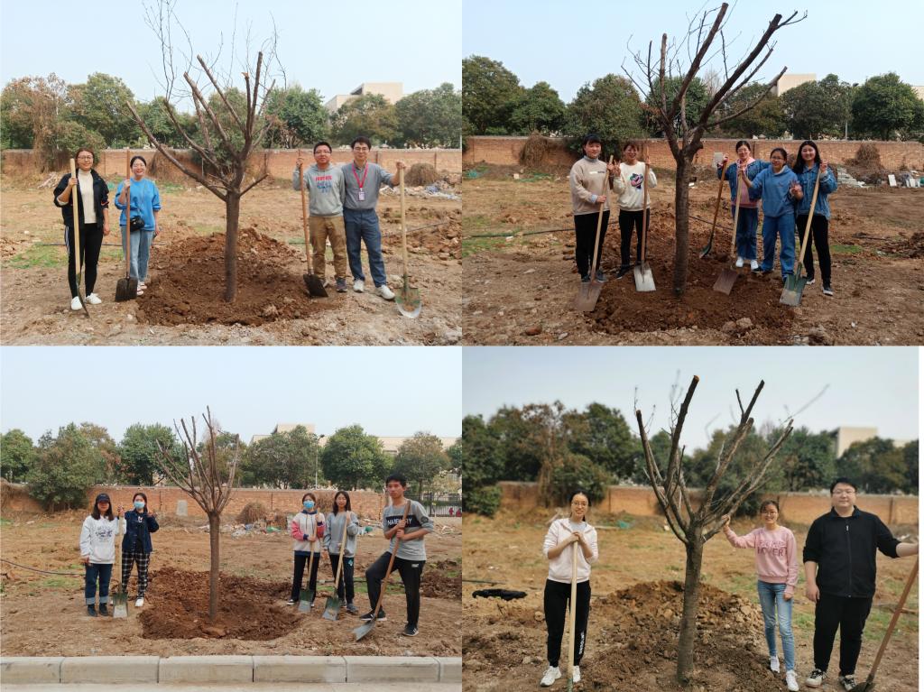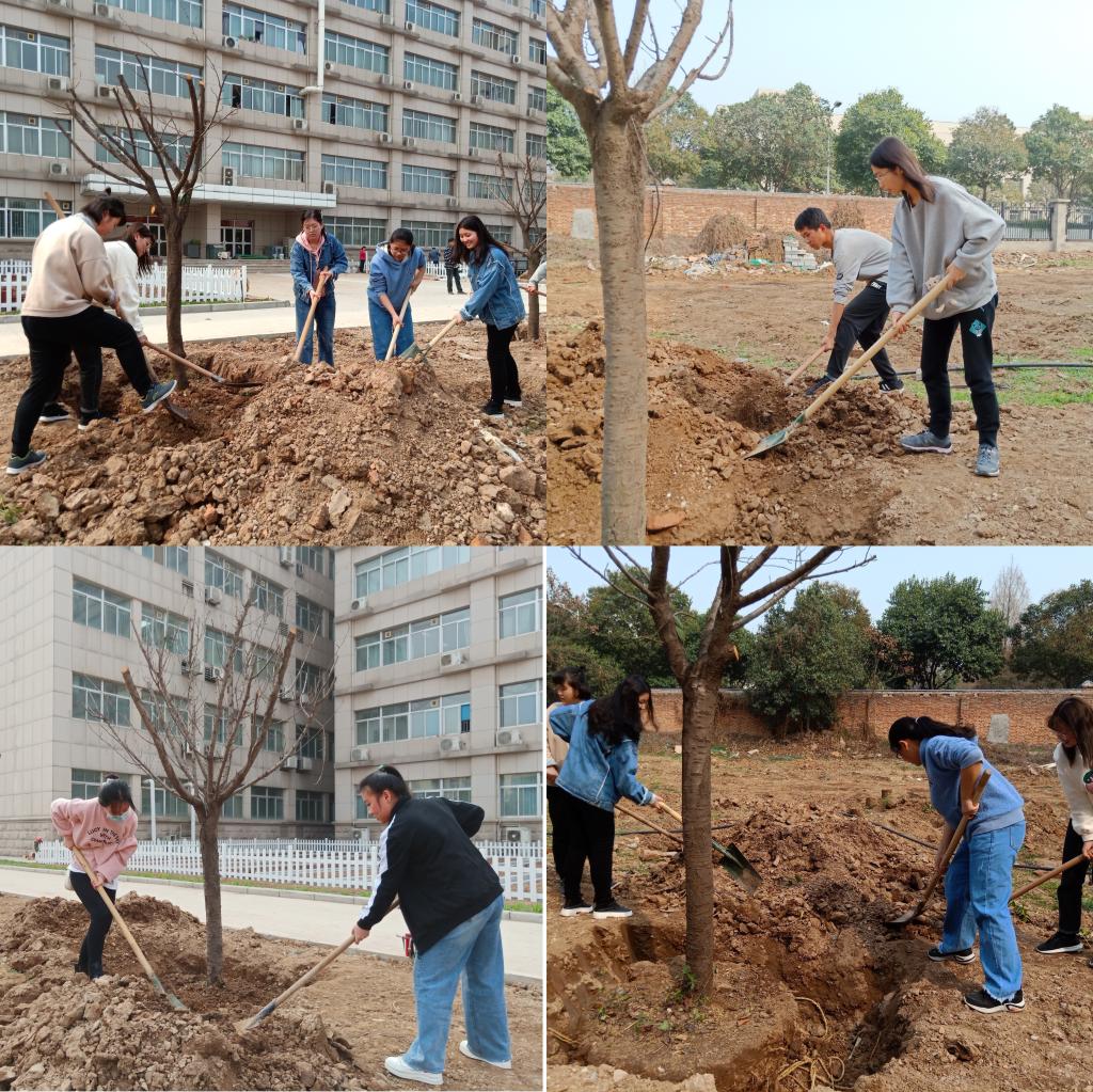 部分学生党员在格物楼东侧开展义务植树活动。