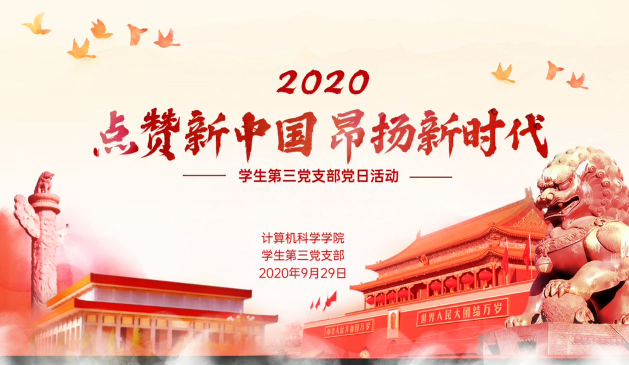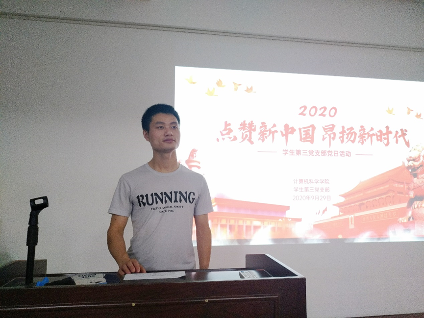 委员会迎接建党100周年行动方案》文件精神,庆祝新中国成立71周年,结合支部学习计划,学生第三党支部于9月29日晚在学院报告厅开展了“点赞新中国 昂扬新时代”党日活动,本次活动由支部书记任仰同志主持,支部全体成员参加。