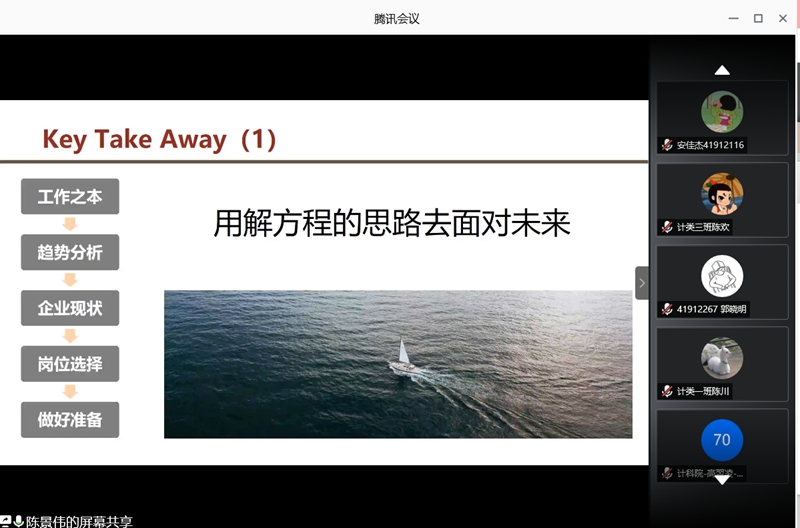 最后,崔瑜璠对陈景伟的分享表示了感谢,并且鼓励同学们善于思考,认真学习,加强对自己的管理,在学习实践中提高自己的综合素质。认清自己,了解自己,知道自己的短板,了解自己的优点,弥补短板发扬优点,在大学生活中,不断锻炼自己,做好职业规划,提升自身在求职就业中的竞争优势。