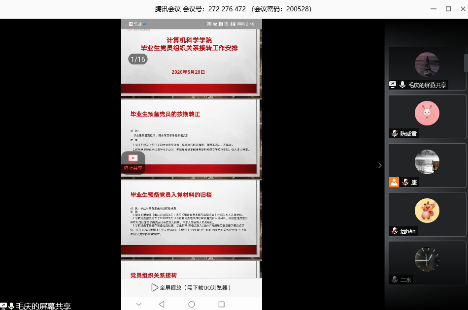 于5月28日下午在腾讯会议平台组织召开2020届毕业生党员组织关系转接工作会议。党委副书记袁冰、本科生支部书记毛庆、研究生支部书记皮安琪、刘亚灵及全体本科生、研究生毕业生党员参加了会议。会议由学院党委组织员郭康凌主持。