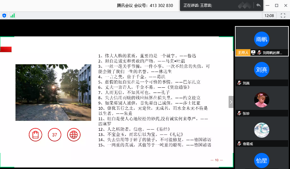 “失信于人者,一旦遭难只有坐以待毙。”活动伊始,王思言以三个诚信小故事切入本次主题。她表示,“诚信是中华民族的优良传统,是做人和做事的道德核心。倘若一个人失去了诚信,那他也就失去了一切。”接着,王思言带领全体同学回顾了有关诚信的格言。通过这些积淀了历史风韵的词句,同学们进一步认识到了诚信的重要性,理解了古人对守信的推崇和对失信的鄙弃。随后,刘雨帆以“成语填空”的小游戏寓教于乐,进一步激发了同学们对诚信的深层理解。在该环节中,全体同学积极主动参与评论区的互动,认真学习了诚信成语的正确写法和释义。之后,同学们互相交流了自己身边的诚信故事。李嘉琪讲述了身边的学生在疫情期间坚持学习努力、同时帮助工厂复工以挣得工资按时偿还助学贷款的诚信故事,体现了当代大学生诚信做人、自立自强的品格。宋澳华则讲述了自己童年时期遇到的反面案例,通过反面教材强调了诚信做人的重要性。通过对身边人、眼前事的叙述,全体同学有了更深刻思考。