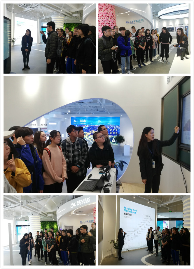 科大讯飞股份有限公司是亚太地区知名的智能语音和人工智能上市企业,在智能语音和人工智能核心研究产业化方面有突出的成就。同学们进入科大讯飞一层的参观展区后,首先被门口的时空隧道吸引,时空隧道尽头是公司最新研究成果——虚拟主播。虚拟主播的声音由机器进行合成,达到了可以使用多种语言自然的发言的效果。在进入展厅之后,最为显目的是“你的世界,因A.I.而能”的标语。随后,接待员带领同学们感受了目前公司最为广泛使用的两项应用——语音识别及实时翻译。同学们纷纷尝试了这两项应用,为它们的准确度惊叹不已。公司将更多亲近人们生活的产品带给广大用户,如主打订票系统的小飞小飞,它可以在有干扰的情况下精准追踪一个人的声音和指令,完成声音所指定的命令。同时公司结合具体实际,在AI教育、AI医疗、AI城市、AI人才培养、AI客服等方面都有较为成熟的产品,帮助特定领域的人群解决实际困难,极大地便利了人们的工作和生活。
