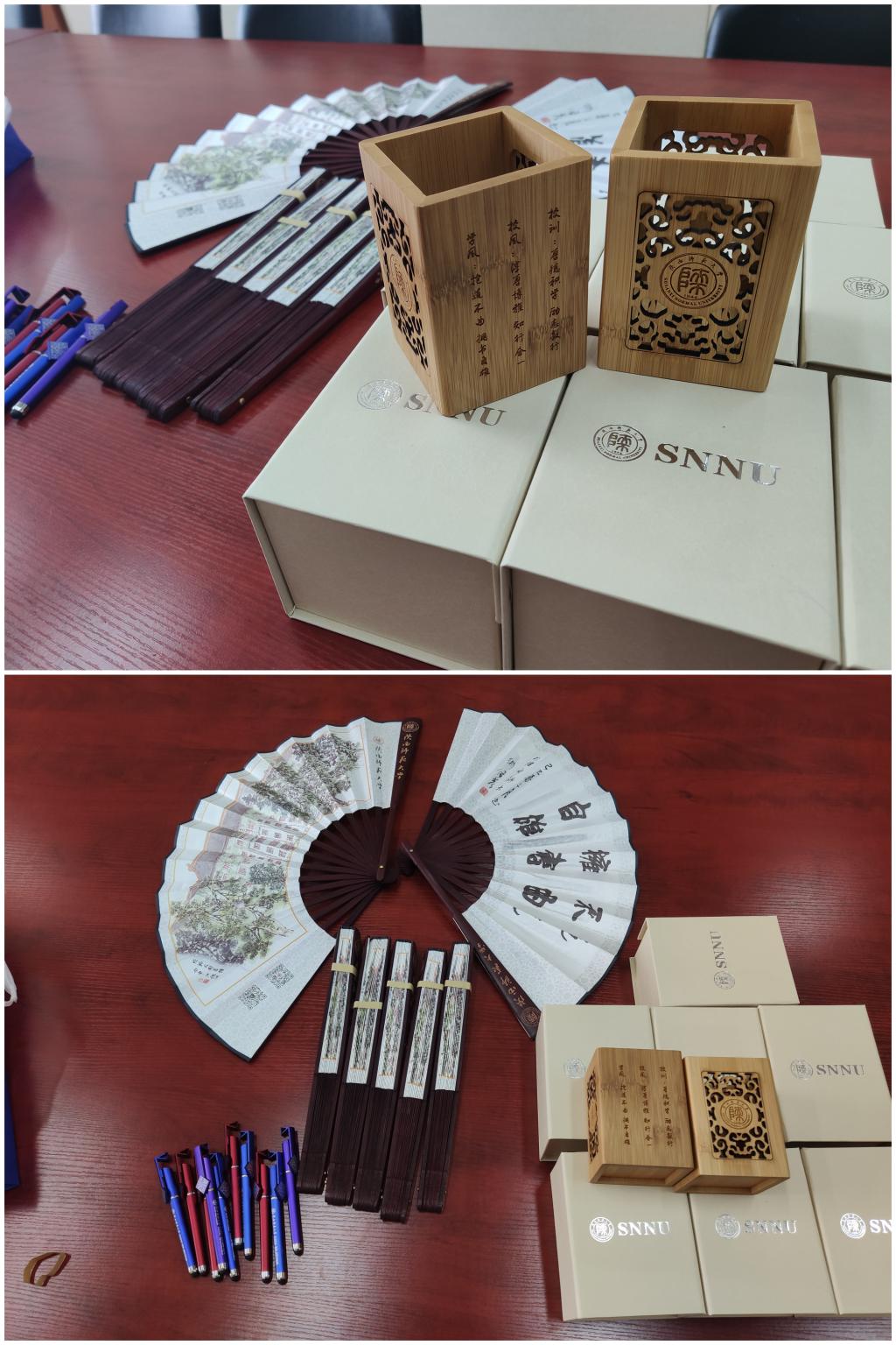 最后,学院院长王小明和党委书记黄怀平代表学院为三位同学赠送了礼物,陕师大竹制笔筒、印有“抱道不曲,拥书自雄”的陕师大纪念扇和印有师大logo的纪念笔,期望同学们能继续发扬师大学风、不忘校训院训、牢记母校教诲,心怀感恩,踏实进取,成为维护民族团结和扎根基层教育事业最闪亮的陕“star”。