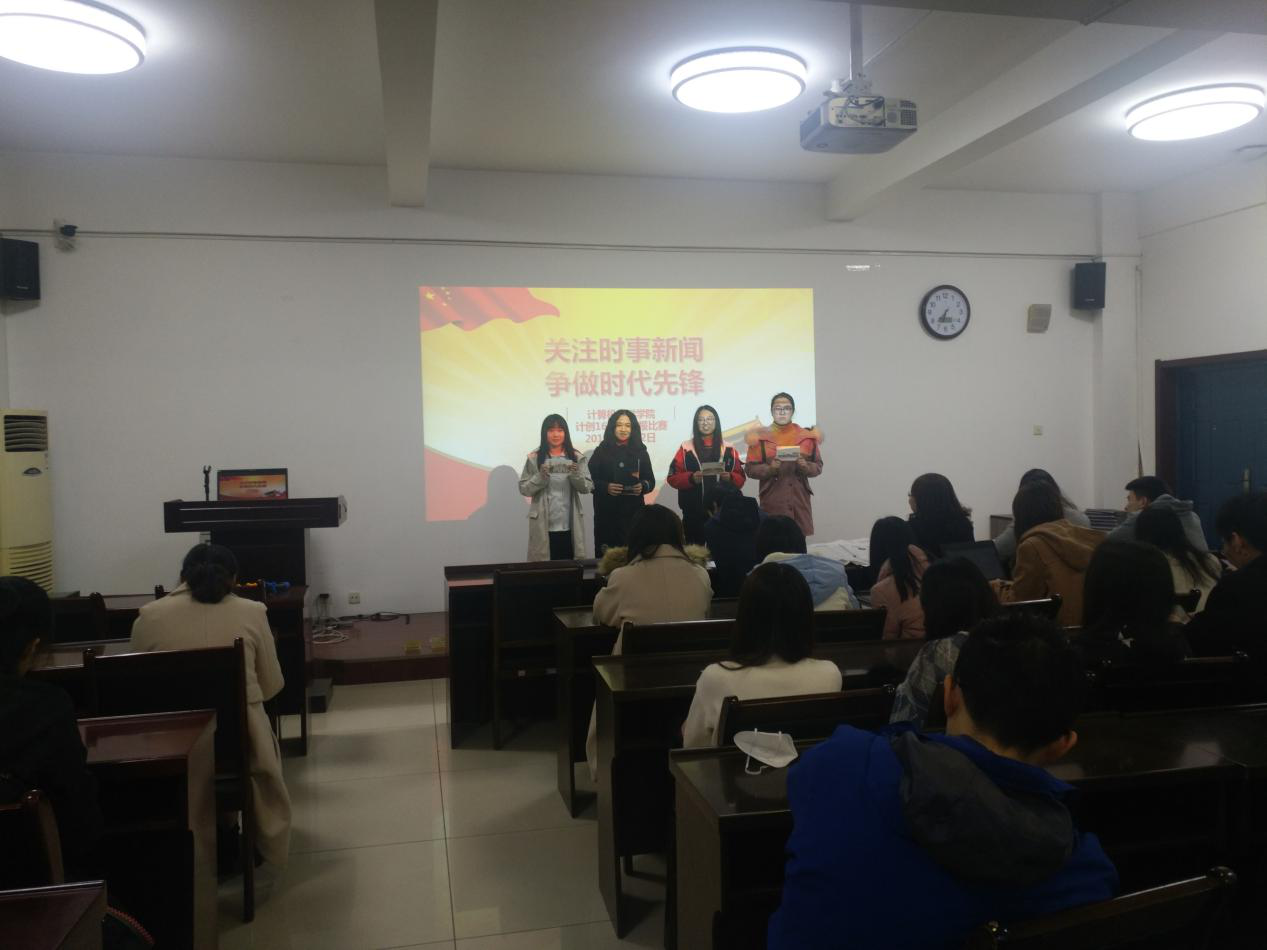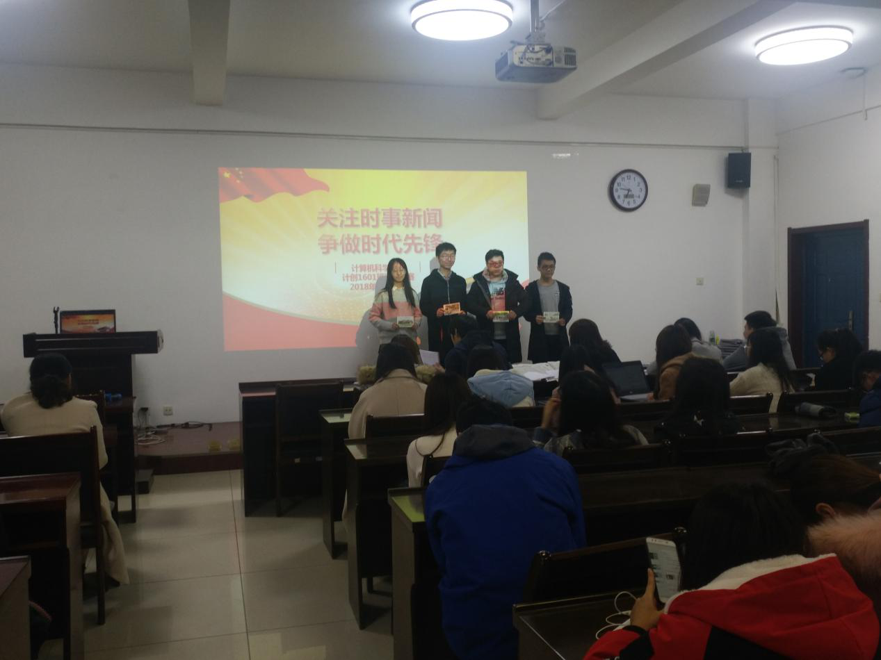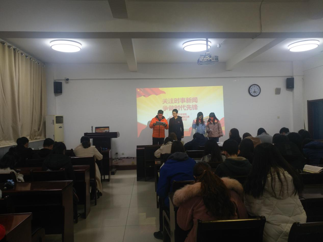 活动开始,郭老师向同学们介绍了本次活动的目的与意义,鼓励同学们关注时事,不仅要拓展有关本专业的视野,更要关注不同领域的最新动态,争做时代先锋,倡导每一位同学参与到国家大事的思考中。班级同学随机分组,按照小组依次上台,根据手中拿到的报纸,分别朗读不同的时事新闻评论等材料,朗读结束后由评委组和郭老师进行点评,颁奖组对表现优秀的同学颁发奖品。