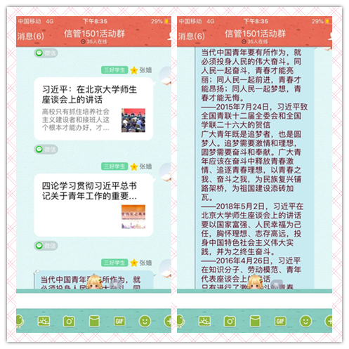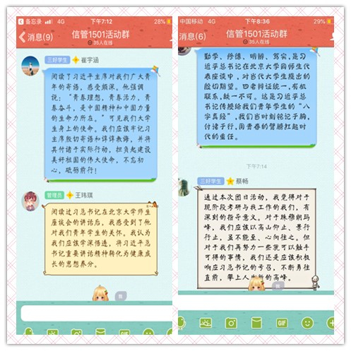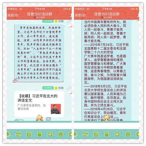 2018年10月27号下午7点,信管1501团支部开展了主题为“与青年说”的线上主题团日活动。活动期间,团支书张嫱在线上与大家分享了习近平总书记对青年寄语节选以及习近平总书记在北大师生座谈会上的讲话原文。同学们在认真学习资料后讨论了各自的学习心得,明确了当代青年的责任。