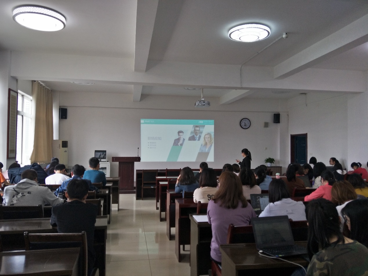 刘汉芳老师从“初入职场”、“认识职场”及“职场应知” 三个方面讲述了职场新人应该注意的关键性问题。首先,新人来到职场给人留下的第一印象往往是由表情、衣着、举止而来。接下来老师在与同学们互动的过程中生动地讲述了如何给人留下良好的第一印象。接下来,刘老师指出,懂得职场的基本礼仪是至关重要的,如电话礼仪、邮件礼仪、介绍他人的礼仪等。此外,老师强调每天的时间都非常的宝贵,大家要学会以目标为导向对自己的时间进行科学的管理。最后,刘老师激励同学们,职场是十年寒窗苦读最好的展示平台,激烈的内外部竞争使得职场是一个逆水行舟不进则退的地方,然而我们想要“走上人生巅峰”则必须经过职场的考验。