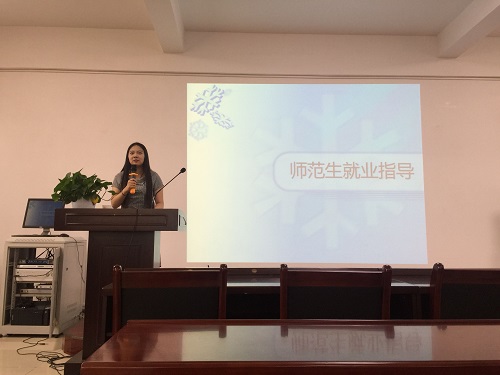 本次讲座的第一位主讲人是2014级计算机科学与技术一班的来自重庆的张晓凤同学,目前签工作于重庆两江新区人民小学。她主要讲了重庆地区的就业形势和面试的基本要求,她告诉同学们要从现在开始为日后丰富的简历内容而努力,各方面的知识都需要有所准备。
