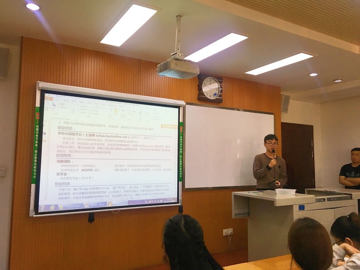 本次讲座的第一位主讲人是2014级软件工程专业的郭浩东同学,目前拿到了滴滴打车和京东两家公司的offer,最终选择了京东。郭浩东主要为同学们解答了找工作的相关问题。他向同学们分享了自己的求职之路和三份不同学长学姐的求职简历,分析了其中的优缺点,告诉同学们简历内容要避免华而不实,将硬件内容写到位。