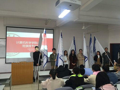 3月25日晚7点,2016级的班旗授予仪式在长安校区文津楼3424成功举办,授旗仪式由2016级本科生辅导员毛庆老师、王靓颖老师主持,两位老师将全新的班旗分发到各个班级的班长手中,并将旗挂上旗杆。各班都在班旗上下足了功夫,展示出自己的风采。计算机科学与技术1602班的芯片的设计,软工1602班的师大全景图给人留下了深刻的印象。