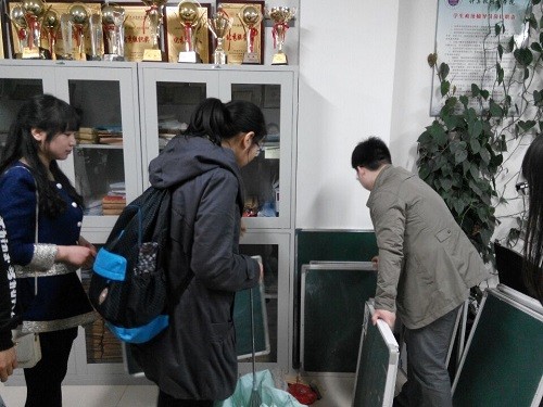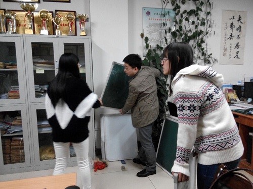 12级计算机科学与技术专业两个班的班长,给各个宿舍配发了小黑板。发黑板前,张冲老师强调,小黑板是学院为大家提供的,希望大家保护好,不要恶意损坏。他还说,板书是教师的一项基本技能,在面试时好看的黑板字会给评委留下深刻的印象,他希望大家好好利用此次机会,提高自己的板书能力。同时,学院为了鼓励大家平时勤练习,会在每周四检查这一周的训练成果,评选出优秀的同学,进行最后的总决赛。