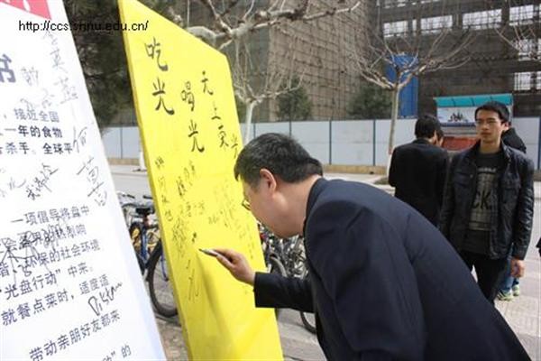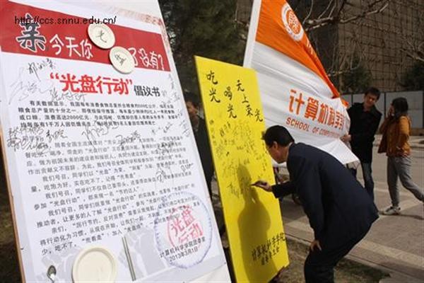 为了响应党和国家的“节约”号召,继承中华民族的传统美德,减少餐桌上的浪费,督促大家节约粮食,爱爱视频 团委学生会在3月5号“学习雷锋日”这一天举行了“光盘行动”,旨在提倡人们在就餐时不浪费粮食,吃光盘子里的东西,吃不完的饭菜打包带走。“光盘行动”是由一家民间公益组织推行的公益活动,它提出的背景是中国日益严重的“舌尖上的浪费”现象。此次活动的主题是:“亲,你今天光盘了没有?” 2013年3月5日11时,在爱爱视频 党委副书记袁冰老师、团委书记胡雯洁老师和10级辅导员张冲老师的带领下,爱爱视频 10级200多名“学雷峰”志愿者们共同参与了“光盘行动”。活动分别在阳光苑一楼、二楼餐厅,溢香楼一楼、二楼餐厅展开。在食堂外,志愿者们手拿标语进行宣传。宣传期间引来了很多学生的关注,据了解,很多同学还是第一次听到“光盘行动”这个名词,对“光盘行动”很是好奇,还不时地看看志愿者手中的“光盘”上的标语,诸如“吃好、喝好、无上荣光”、“杜绝中国式盛宴”、“吃光盘中餐,不做剩男剩女”等等。他们之中有很多同学在了解之后都积极地参与其中,并对我们的活动给与了大力的支持。到学生进餐时间,志愿者手拿写有标语的光盘进入餐厅内宣传,部分餐桌上还摆放了“光盘行动”的标语,温馨提示大家吃光盘中餐。对积极响应并参与此次活动的同学,学生会成员们还特意制作了“光盘行动”的签名板,让同学们在签名板上留下自己“光盘”的决心。