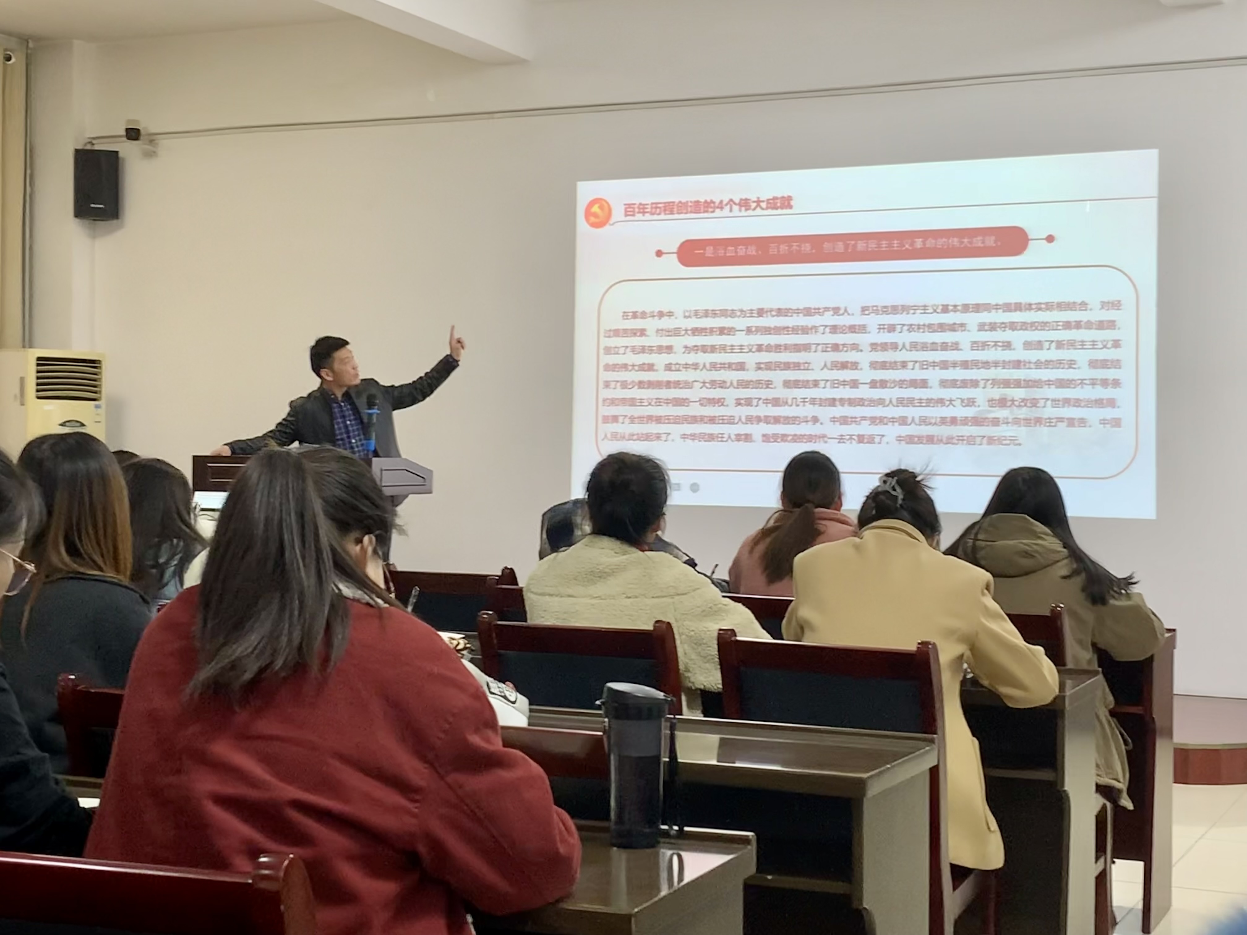 学生第一党支部党员讲授题为《数览十九届六中全会精神》专题党课,支部全体党员聆听授课,活动由党支部书记田海东主持。