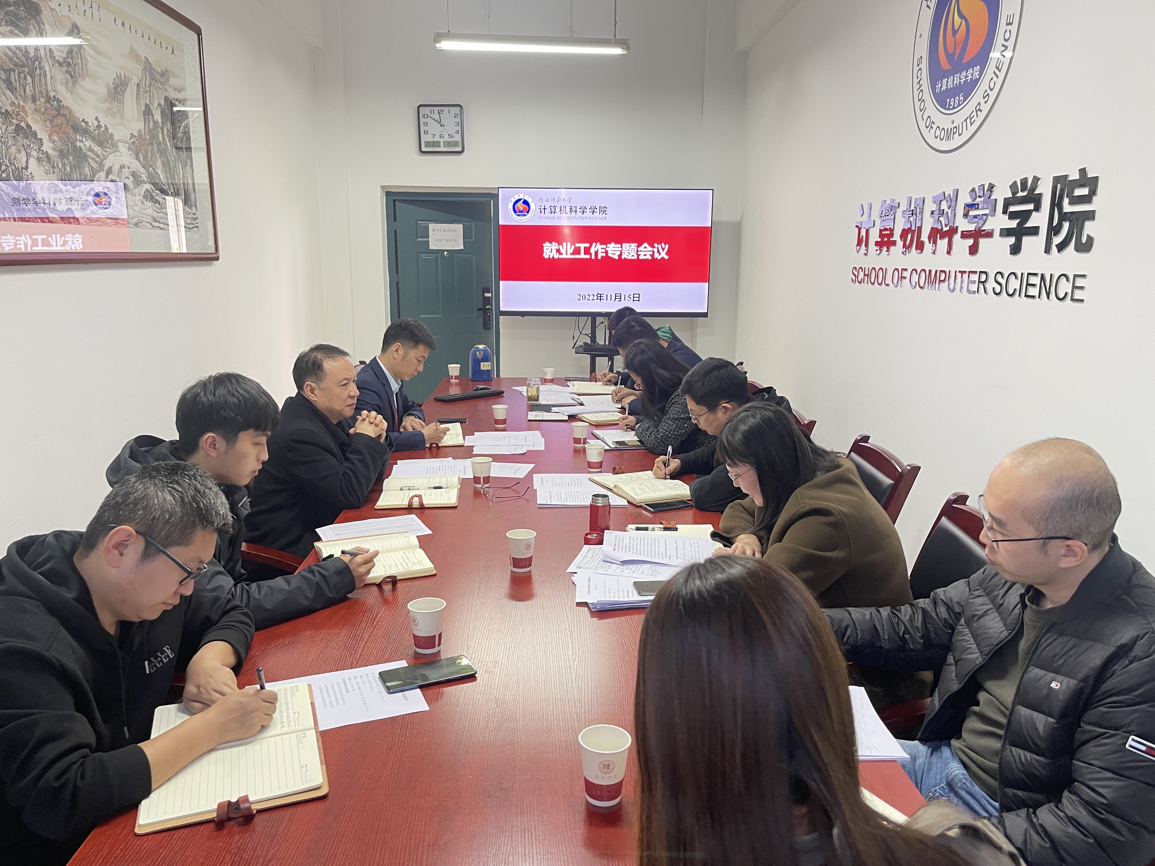 在文津楼3434会议室召开2023届毕业生就业工作专题会议。学院党委书记王耀明、院长王小明,副院长李鹏、马苗、裴炤、董春生、任杰,党委副书记郭康凌、团委书记何文曦、办公室主任赵铎,毕业班辅导员袁珂月、刘柱参加会议。
