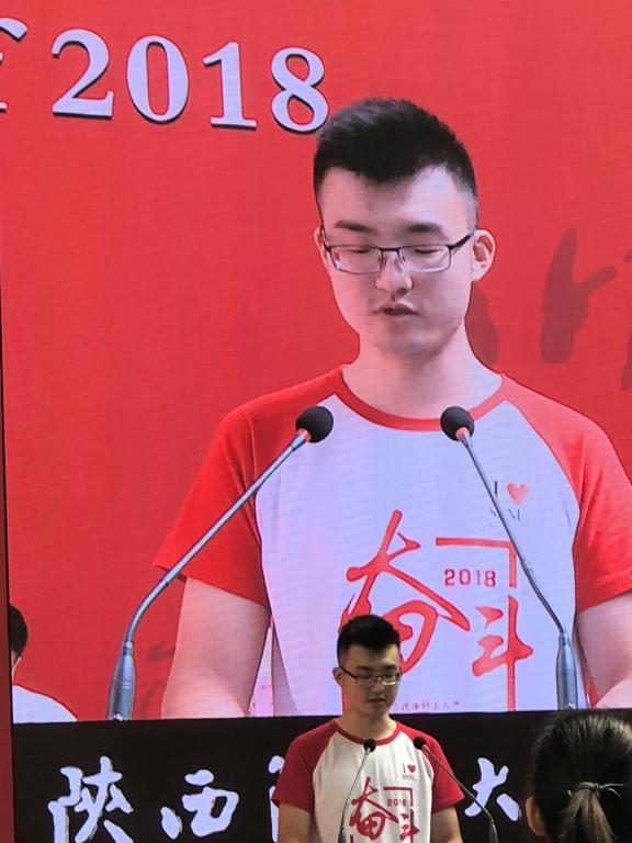 2014级公费师范生李天宇。四年前,我们手持散发浓浓墨香的通知书,满怀憧憬地走进师大;四年来,我们无时无刻不感受着十三朝古都的厚重,体味着师大雁塔校区的古朴典雅、钟灵毓秀,长安校区的现代开放、气势恢宏。今天,我们即将带着“厚德、积学、励志、敦行”的校训精神离开母校,我们无悔自己当初的选择,更要感谢自己四年来的奋斗。